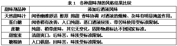取500ML36度酒液,根據甜味劑的不同倍數,分別添加各種甜味劑,最終使甜度一致。各種甜味劑對酒液的風格結果見表1。