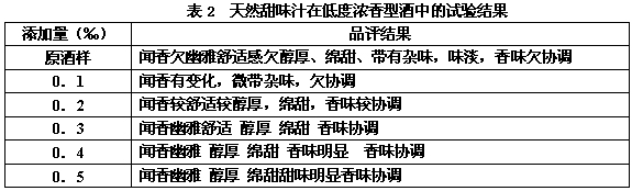 在低度白酒勾兌中,天然甜味汁甜度倍數高,用量甚微,不會增加低度酒中的固型物含量,使酒體固型物含量遠遠低于GB/T10781.1-2006國家標準。