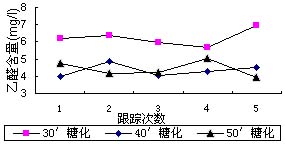 從圖4可看出:30分鐘糖化其成品酒乙醛含量最高,即長時間糖化休止、糖化強度加強,將有利于降低成品酒乙醛含量。
