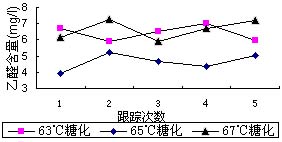 從圖3可看出:65℃糖化有利于降低成品酒乙醛含量。就跟蹤檢測數據而言,65℃糖化較63℃糖化或67℃糖化,其成品乙醛含量下降幅度約為20%。