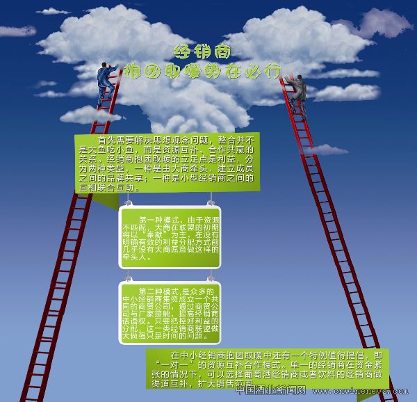 在中小經銷商抱團取暖中還有一個特例值得提倡,即一對一的資源互補合作模式。隨著消費品類多元化,消費者的消費習慣也發生了很大變化,葡萄酒也逐漸走上了宴席的桌面,現在婚宴上都會做紅白和飲料搭配。所以單一的經銷商在資金緊張的情況下,可以選擇葡萄酒經銷商或者飲料的經銷商做渠道互補,擴大銷售范圍。