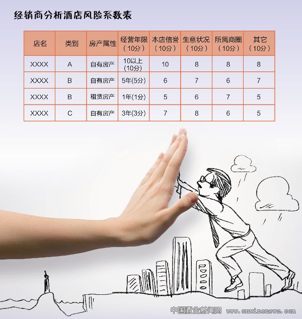 經銷商可以派駐員工從多角度分析酒店經營及發展狀況:觀察用餐時間該酒店停車場停放車輛檔次、數量和車牌號碼,餐后離開酒店的客人人數等,判斷該店的上座率和用餐客人檔次;觀察酒店垃圾存放處,判斷該店酒水消費品牌、價位和數量;了解服務員工資和獎金發放是否及時,判斷該店的經營狀況;咨詢酒店其他酒水供應商、業務員、原料供應商等了解結賬信譽、口碑評價;通過工商、稅務、衛生防疫、房東等渠道了解該酒店的經營狀況。至少要歷經幾個月的摸底兒工作,全面掌握新酒店各方面的情況。同時,對該酒店作個全面的評估,然后納入公司的酒店終端管理體系進行風險預警管理。