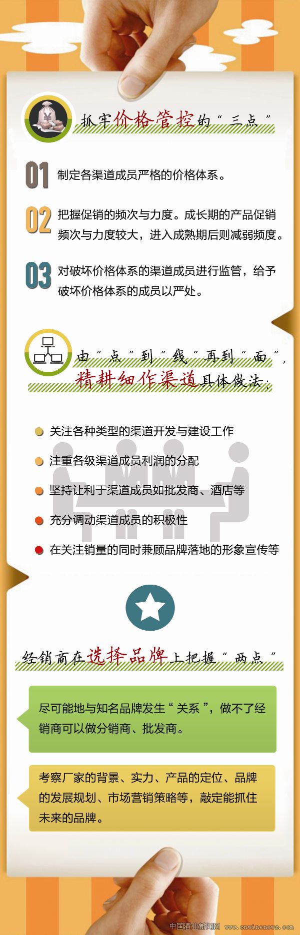 現(xiàn)在的市場競爭越來越激烈,經(jīng)銷商要想在激烈的市場競爭中做大做強(qiáng),必須在渠道上實(shí)行精耕細(xì)作的渠道策略,要注重終端的長期建設(shè)、構(gòu)建可持續(xù)發(fā)展的渠道盈利模式,追求牢固的市場基礎(chǔ)打造與品牌影響力的長期營造,逐步將市場網(wǎng)絡(luò)由“點(diǎn)”到“線”再到“面”。具體做法表現(xiàn)為:關(guān)注各種類型的渠道開發(fā)與建設(shè)工作、注重各級(jí)渠道成員利潤的分配,堅(jiān)持讓利于渠道成員如批發(fā)商、酒店等,充分調(diào)動(dòng)渠道成員的積極性;在關(guān)注銷量的同時(shí)兼顧品牌落地的形象宣傳等等。