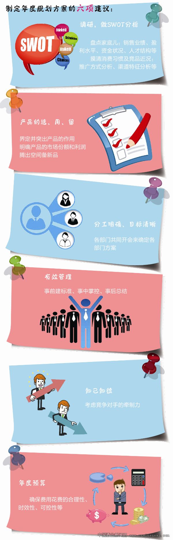 年度規(guī)劃需要抽出公司的精兵強將對市場信息和公司數據庫進行調查和篩選。調查內容主要分為兩部分:內部主要清楚自己的家底,如資金狀況、人才結構、產品生命周期、市場網絡等,是否得到了最佳匹配,還有多少潛力可挖掘等;外部主要是當地的經濟狀況、消費習慣及主要競爭對手的競品分析、推廣方式分析、傳播方式分析、銷售模式分析、渠道特征分析等。把這些問題都搞清楚了,然后做SWOT分析,制定切合實際的年度目標并制定出匹配的年度規(guī)劃,如此才能保證公司資源的充分利用并降低外部風險,年度銷售目標自然會順利完成。
