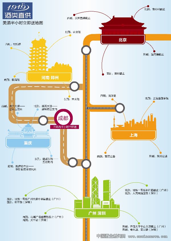 目前,1919的線上是由CRM、ERP、LBS、呼叫中心、酒類商城、第三方平臺等構建的信息化銷售、客戶管理平臺;線下通過與線上共享的信息系統,實現集零售、展示、物流、服務、推廣為一體的多種運營業態,包括1919數字旗艦店、1919酒類連鎖超市、1919進口酒商店、1919酒類網上商城、1919商場店中店、1919戰略合作配送商等。
