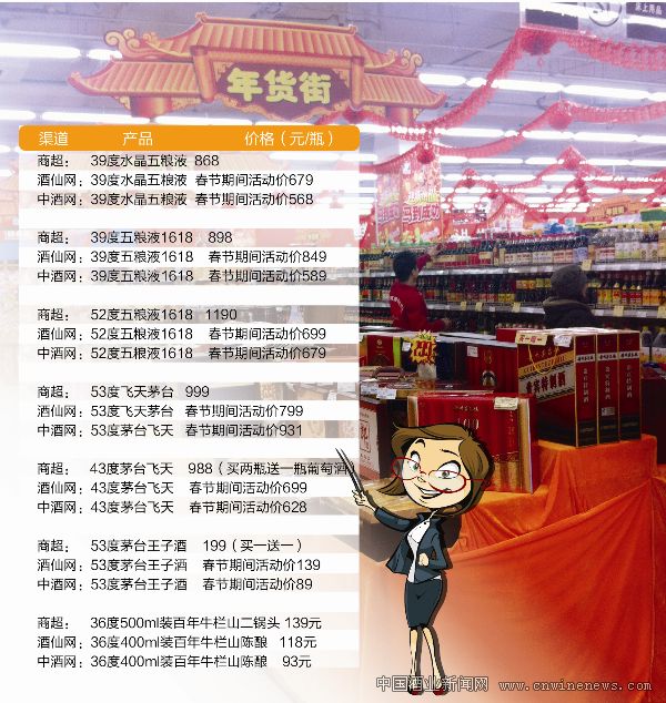 “今年春節期間白酒的促銷力度很大,買茅臺、五糧液等高端酒,現在的價格最合適。中高檔酒中,300元~500元的價位優惠不明顯,200元~300元的價位優惠比較明顯,一般都是買一送一,有的還加送一瓶葡萄酒;100元~200元的價位優惠最為明顯,80%~90%的酒都有促銷活動,有買一送一,更有最多直接降價40元后再買一送一。”位于北京南三環附件首航超市的促銷員對《華夏酒報》記者說。