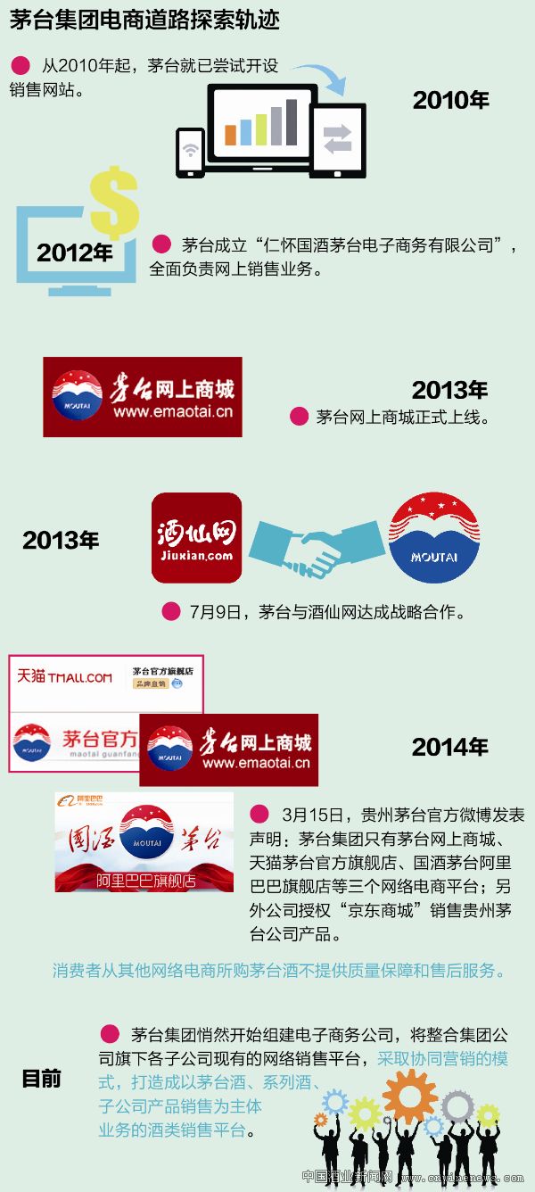2014年初,當(dāng)茅臺宣布與之合作的電商平臺只有子公司仁懷國酒茅臺電子商務(wù)公司運(yùn)營的茅臺網(wǎng)上商城、天貓茅臺官方旗艦店、國酒茅臺阿里巴巴旗艦店等三個(gè)網(wǎng)絡(luò)電商平臺,另外授權(quán)“京東商城”銷售貴州茅臺公司產(chǎn)品時(shí),有關(guān)其下一階段電商化如何推進(jìn)的猜測紛紛涌起,而如今,茅臺試圖組建電子商務(wù)公司,整合旗下子公司現(xiàn)有網(wǎng)絡(luò)銷售平臺的消息傳出。似乎茅臺的電商化路徑已經(jīng)有了新的方向。