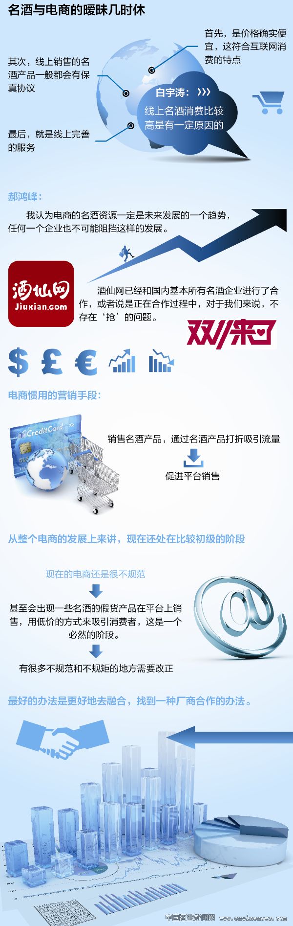 “我認為電商的名酒資源一定是未來發展的一個趨勢,這是肯定的,任何一個企業也不可能阻擋這樣的發展。但是我們不知道別人是什么樣的想法和做法,到今天為止,酒仙網已經和國內基本所有規模以上的名酒企業都進行了合作,或者說是正在合作的過程中,對于我們來說,不存在‘搶’的問題?!本葡删W董事長郝鴻峰在酒仙網2014年“雙11”啟動儀式上對《華夏酒報》記者說。
