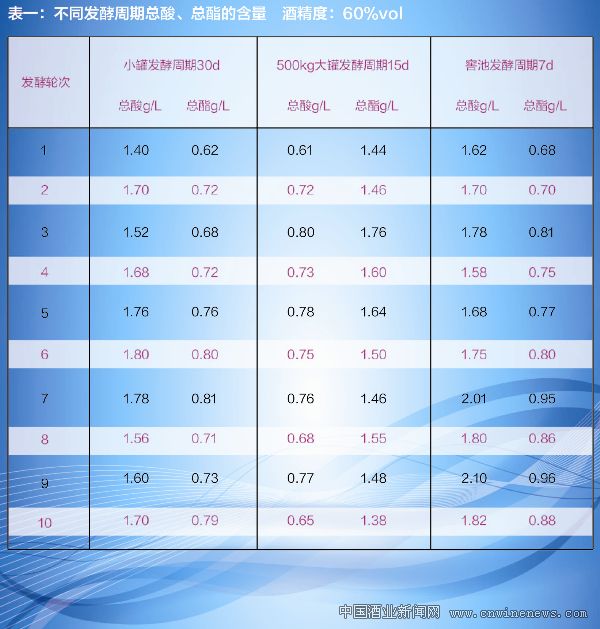 3.4 大缸發酵,溫度相應集中散熱少,升溫快,發酵速度也加快,酸的生成比例比小罐的多,特別是乙酸、乳酸及其酯類物質,故產出的酒香濃郁,酒體豐滿;
