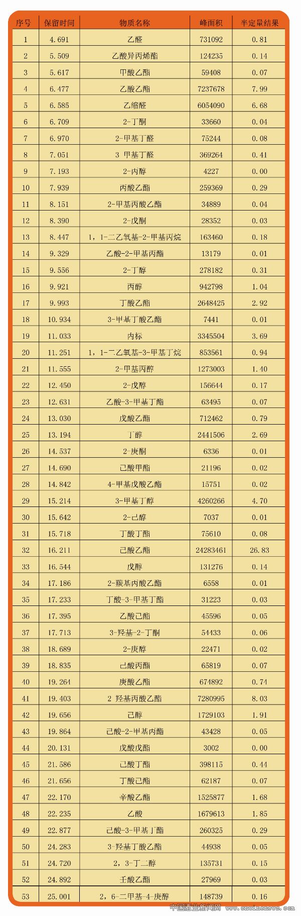 利用先進的氣質(zhì)聯(lián)用儀GC—MS2010PLUS,通過準確定性和定量來剖析古貝春白酒的內(nèi)在物質(zhì)成分并分析其特點文章來源華夏酒報,來初步探討古貝春酒的風(fēng)格特點。