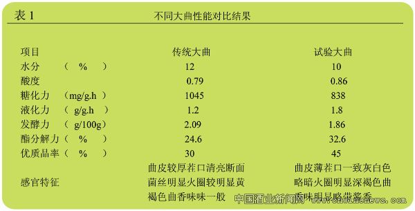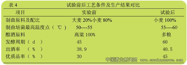 采用中高溫培菌制曲,降低了酒醅中蛋白質的含量,減輕了酒的苦味,既降低了物耗又增加了曲香,培養了耐高溫微生物菌群,提高了大曲質量,為多糧發酵打下了堅實的基礎。