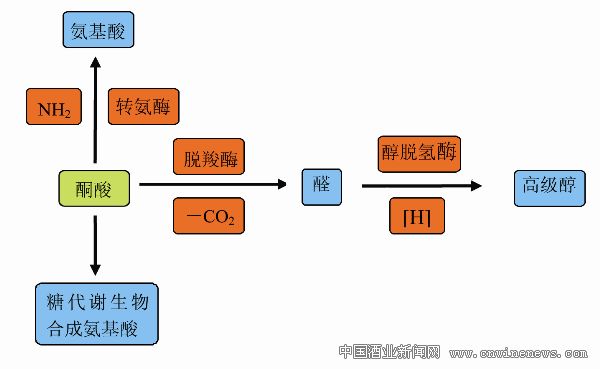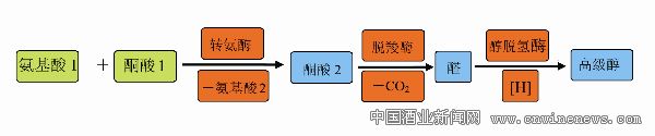這兩條途徑合成高級醇的量有一定的比例,25%的高級醇類來自氨基酸代謝,75%來自糖代謝。在氨基酸代謝中特定的氨基酸形成特定的高級醇,亮氨酸代謝生成異戊醇,纈氨酸代謝生成異丁醇,蘇氨酸代謝生成正丙醇,苯丙氨酸代謝生成苯乙醇等。