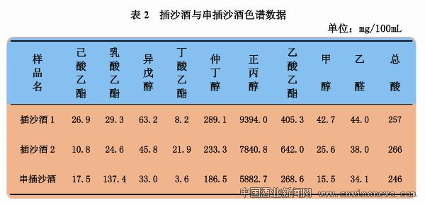 目前大型企業,把這部分插沙酒當做廢酒處理,直接輸送到污水處理廠處理。一部分中小企業是把這部分插沙酒存放起來,到這一生產周期快結束的時候,最后一次取酒時放入底鍋中串出。串出的插沙酒各種雜味依舊很重,利用價值很低。插沙酒與串插沙酒色譜數據如表2。