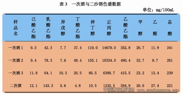 醬香工藝的一次酒的質量優于插沙酒,二次酒質量顯著優于一次酒。一次酒的正丙醇含量可能高于插沙酒,即使如此一次酒的香味和口感還是優于插沙酒。相關色譜數據見表3 。