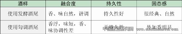進(jìn)一步可作小樣對比試驗(yàn):在同樣的酒基條件下,設(shè)定融合度、持久性及固態(tài)感3項(xiàng)對比指標(biāo)(見下圖)