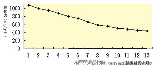 若貯存期過長(6個月以上),曲子易受潮,在夏季易生曲蟲,曲色暗淡無光澤,曲香味淡,有邪雜味產生,活菌數量減少,糖化力、發酵力較低,此時應慎重使用。不同儲存期河內白曲糖化力變化見表1。