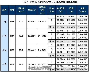 用上述辦法,使用該四個密度瓶分別測定不同批號的39°孔府家盛世大陶酒進行比較,結(jié)果見表2。