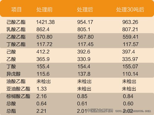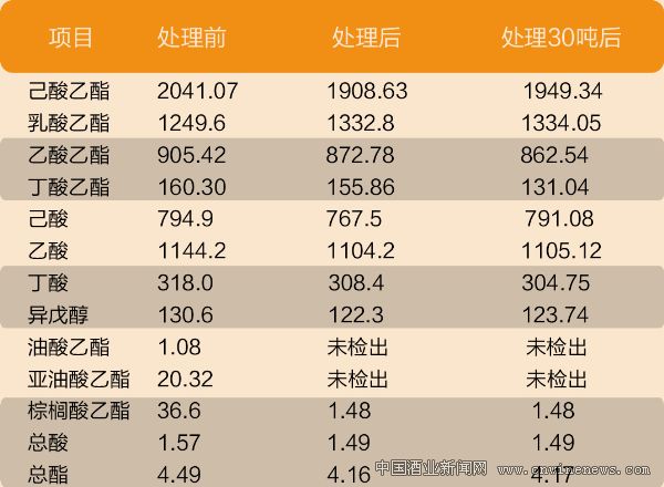 對于不同的酒需采用不同的活性炭。本次實驗中凈化器中填充的是ZS-901鐘山介質。處理前后數據如下: