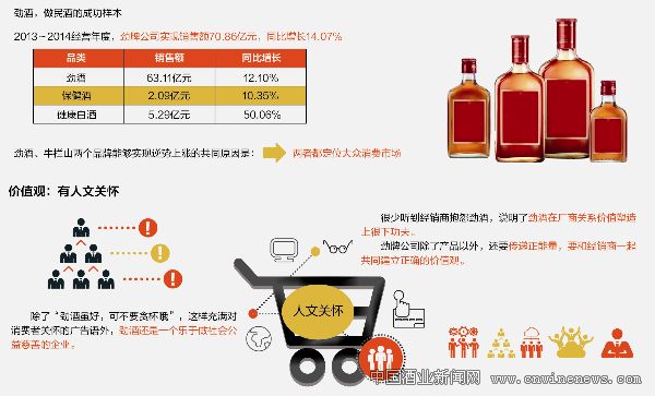 有券商研究員表示,以勁酒、牛欄山為代表的定位于大眾消費的酒水,不依賴于公務消費,這讓其市場比較健康。同處10元~20元價位區間,“中國勁酒”125毫升規格在2011年的時候,年銷量便已高達5.5億瓶,牛欄山陳釀綠瓶牛二2013年銷售達2.4億瓶,更誘發了各酒企對大眾市場空間的向往。