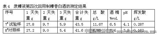 試驗樣:第三次回用試驗后的糟液用綢袋布過濾,得濾液作第四次回用試驗。頭吊糟、回用糟濾液攪勻用無水碳酸鈉調整酸度,加熱煮沸冷卻后,于55℃—60℃加糖化酶,糖化3小時—4小時,而后加干酵母投料發酵,在30℃發酵3天。對照樣:頭吊糟、水攪勻加熱煮沸冷卻后,于55℃—60℃加糖化酶,糖化3小時—4小時,而后加干酵母投料發酵,在30℃發酵3天;結果見表4。糖化結束后測得:試驗樣醪液糖度17.2°Bx, pH值4.2;對照樣醪液糖度16.5°Bx, pH值4.8。