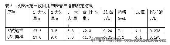試驗樣:第二次回用試驗后的糟液用綢袋布過濾,得濾液作第三次回用試驗。頭吊糟、回用糟濾液攪勻用無水碳酸鈉調整酸度,加熱煮沸冷卻后,于55℃—60℃加糖化酶,糖化3小時—4小時,而后加干酵母投料發酵,在30℃發酵3天;對照樣:頭吊糟、水攪勻加熱煮沸冷卻后,于55℃—60℃加糖化酶,糖化3小時—4小時,而后加干酵母投料發酵,在30℃發酵3天;結果見表3。糖化結束后測得:試驗樣醪液糖度17.2°Bx, pH值4.2;對照樣醪液糖度16.5°Bx, pH值4.8。