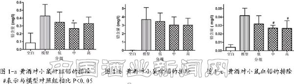 雄性ICR小鼠分為空白對照組、模型對照組和高中低三個劑量組。空白對照組給予基礎飼料,模型對照組以及低中高三個劑量組給予含鉛飼料的同時灌喂黃酒,30天后,測定血、股骨、肝組織鉛含量。測定結果顯示:黃酒可明顯降低肝組織、血鉛含量,并具有劑量效應。而劑量組與模型對照組之間骨鉛水平無顯著性差異,但隨著劑量的增加,小鼠骨鉛含量減少(見圖1-a、1-b、1-c)。