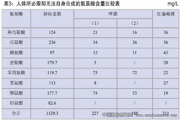 3.1 妙府老酒是發酵原汁壓榨酒,所含的碳水化合物基本上都是發酵產生的葡萄糖、果糖、低聚糖(麥芽糖、異麥芽糖、乳糖),其可以直接被人體吸收,進而產生能量,其余部分以糖原的形式貯存到肝臟和肌肉中,不易使人發胖。妙府老酒的發熱量為80Kcal/100ml—90Kcal/100ml,啤酒一般為50Kcal/100ml—60Kcal/100ml,白酒一般為200—300Kcal/100ml;妙府老酒的發熱量比啤酒多、比白酒少,在體內消化吸收后,一方面,妙府老酒能滿足和供給人體組織細胞的能量需要;