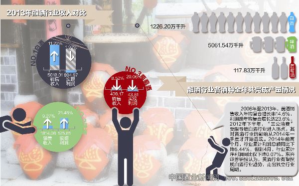 統計數據顯示,2013年,釀酒行業全年共完成產量7511.88萬千升,同比增長4.86%。全行業完成銷售收入8453.21億元,同比增長9.42%;實現利潤1062.11億元,同比增長0.17%。