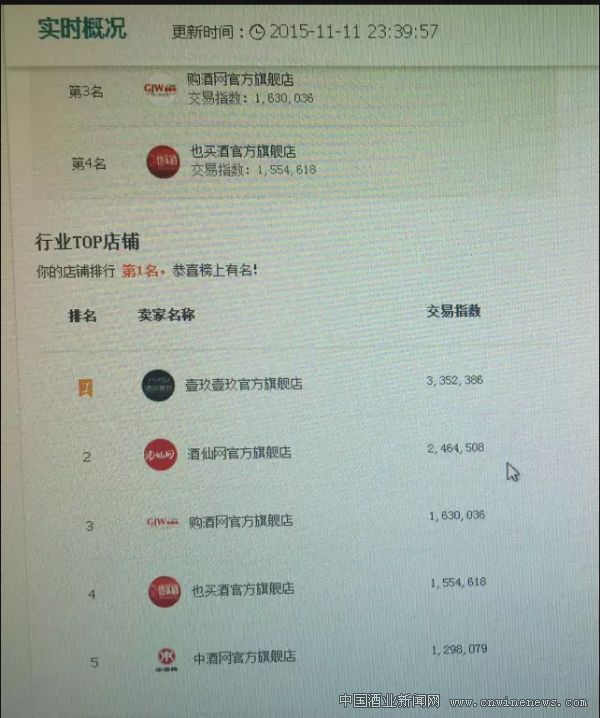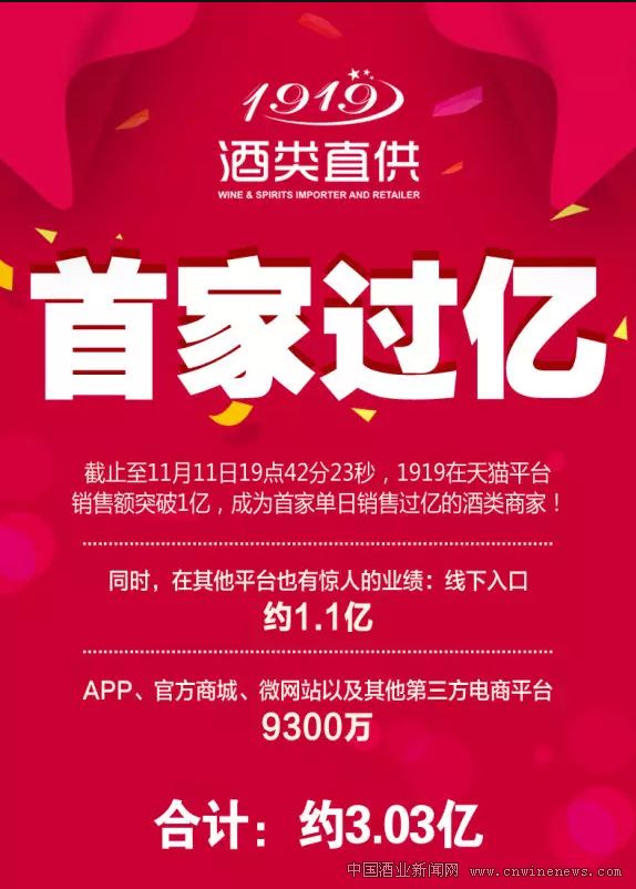 今天晚間19:42,1919酒類直供“雙十一”全網銷售額已經達到3.03億元,穩居酒業銷售排名第一位。