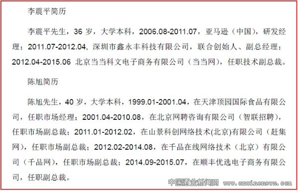 據(jù)了解,李震平在入職酒仙網(wǎng)之前為當(dāng)當(dāng)網(wǎng)技術(shù)副總裁,陳旭在入職酒仙網(wǎng)之前為順豐優(yōu)選副總裁。