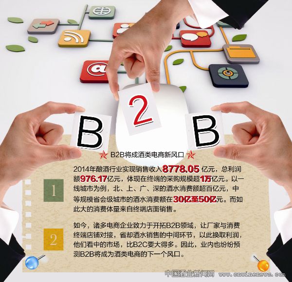 有觀點(diǎn)認(rèn)為,酒類行業(yè)很可能是繼鋼鐵、化工、農(nóng)產(chǎn)品后的又一個契機(jī)——市場體量大,2014年釀酒行業(yè)實(shí)現(xiàn)銷售收入8778.05億元,利潤總額976.17億元,體現(xiàn)在終端的采購規(guī)模超過1萬億元。據(jù)估計,這個萬億市場中,可能有半壁江山將成為酒業(yè)B2B的天下。