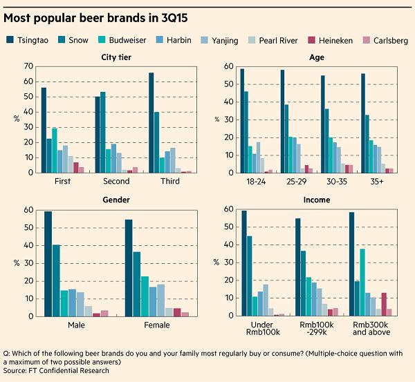 對更優質啤酒的需求當然一直都存在:投資參考的調查發現,58%的受訪者通常花超過6元人民幣(0.95美元)購買一瓶330毫升的啤酒,這一價位在啤酒商看來屬于中檔及以上。