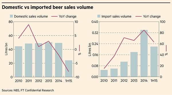 但即便作為市場領先者的青島啤酒和華潤雪花啤酒(CR Snow)——他們的中等價位及高端啤酒的銷量分別占到總銷量的40%和45%——也面臨進口品牌快速增長帶來的挑戰。上半年國產啤酒的銷量出現下滑,但進口啤酒銷量上升了63%,繼續保持了近年來的快速增長勢頭,原因包括進口成本大大降低以及國內夜店數量大增。