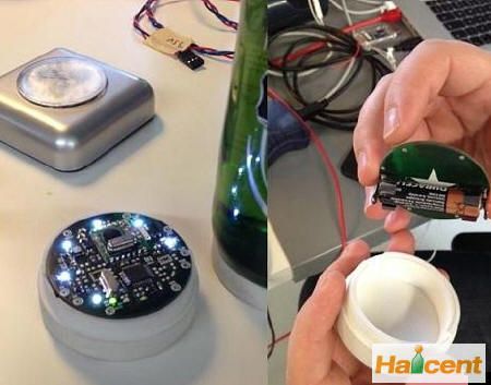 這還多虧3D打印技術,每個智能酒瓶的底部都粘貼了一塊電子元件,它包含8個LED燈,一個8-bit的微處理器,一個加速計,一個陀螺儀,一塊電池和一塊帶天線的無線網絡收發器,所有這些配件被安置在一塊2歐元硬幣大小的電路板上。LEDs朝向酒瓶底部安裝,因而,當LED燈亮時就能照亮整個酒瓶,但當酒瓶是滿得時,酒瓶亮度會有所減弱。