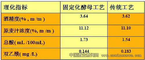 對主發酵結束后的嫩啤酒進行酒精含量、原麥汁濃度、總酸含量和雙乙酰文章來源華夏酒報含量等主要理化指標的測定,以考察采用泡沫陶瓷固定化酵母細胞啤酒連續主發酵工藝是否影響啤酒的質量。酒精含量:蒸餾法;原麥汁濃度: 比重瓶法;總酸含量:滴定法;雙乙酰含量:蒸餾法。