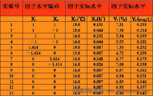 為使固定化連續發酵技術能應用于啤酒的整個發酵過程,在保證主發酵終了時酒液實際濃度較低的前提下,雙乙酰含量也應盡可能的低,所以確定主發酵實驗綜合考察酒液濃度的降低及雙乙酰含量這兩個指標,影響因素主要是發酵溫度和稀釋率。通過預實驗確定中心點(零水平),應用二次通用旋轉中心組合實驗設計的方法來安排實驗。兩因素(發酵溫度和稀釋率)上、下水平及r的取值依據是酵母細胞對溫度的要求及預期的發酵時間。對實驗結果進行回歸分析及優化處理,獲取泡沫陶瓷固定化酵母細胞啤酒連續主發酵優化的工藝條件。