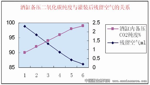 因此,首先要保證CO2純度在99%以上。對(duì)采用不同純度CO2進(jìn)行酒缸備壓灌裝后檢測(cè)瓶頸控制,檢測(cè)結(jié)果見(jiàn)表1。