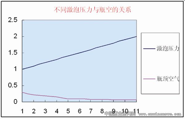 為了能很好地控制成品啤酒瓶頸中空氣的含量,筆者通過(guò)對(duì)不同激泡壓力進(jìn)行試驗(yàn),并檢測(cè)相應(yīng)的瓶頸空氣含量,并保證灌裝容量的要求,最終選擇最佳的激泡壓力。之前控制激泡壓力都在1.0Mpa—2.0Mpa之間。
