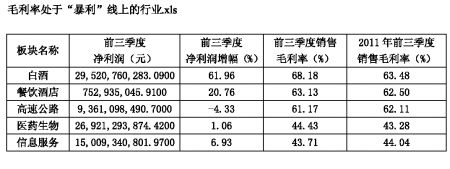 統計顯示,白酒行業依舊為今年前三季度整體毛利率最高的行業,13家白酒類上市公司的整體毛利率達到68.18%,同比上升4.7個百分點。僅次于白酒板塊的“暴利”行業則出人意料地落在了餐飲酒店板塊,9家公司的整體毛利率達到63.13%。而一直叫苦“只是為銀行打工”的高速公路上市公司的整體毛利率雖然較去年同期略有下滑,但至今年三季度末時仍能維持在61.17%的相對高位。