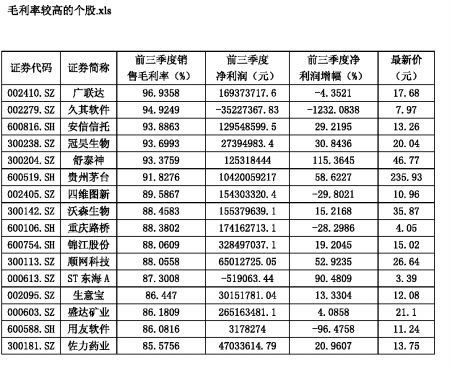 雖然A股上市公司今年前三季度的整體盈利能力創下2008年同期以來的最低值,但仍有部分行業和上市公司的盈利能力維持在“銷售毛利率40%”這條“暴利線”的上方。