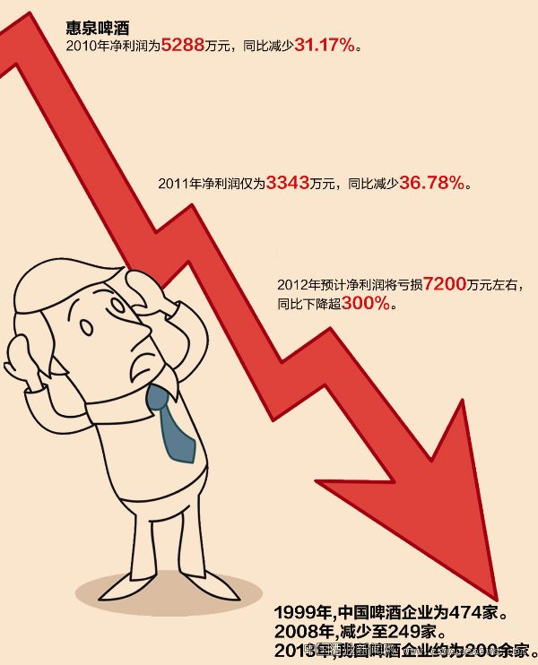1月29日,福建惠泉啤酒股份有限公司發布2012年度業績預虧公告,預計2012年年度歸屬上市公司股東的凈利潤將虧損7200萬元左右。相比2011年惠泉啤酒歸屬上市公司股東3343萬元凈利潤,同比下降超300%。