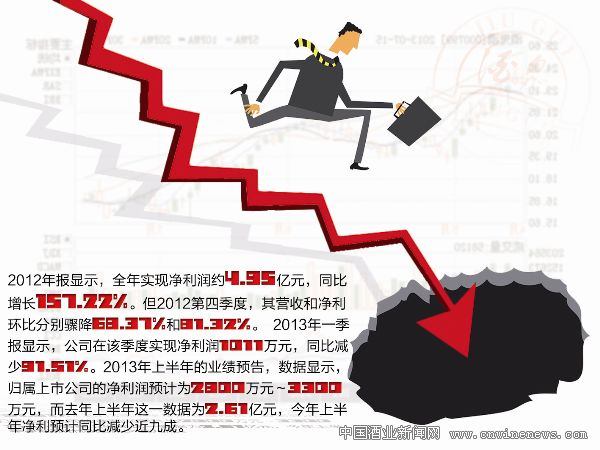 7月9日,酒鬼酒(000799)發布了2013年上半年的業績預告,數據顯示,歸屬上市公司的凈利潤預計為2800萬元~3300萬元,而去年上半年這一數據為2.61億元,今年上半年凈利預計同比減少近九成,可謂觸目驚心。如果進一步分析酒鬼酒業績跳水的深層次原因,不難發現其后市發展仍將受困于諸多不利因素,可謂前途坎坷。