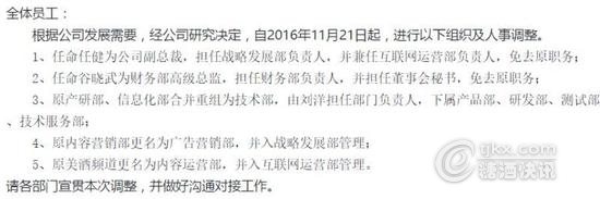 原網酒網戰略管理部VP任健接任公司副總裁一職,并擔任戰略發展部負責人,同時任命谷曉武為財務總監,同時接替張智健擔任董事會秘書一職。網酒網原副總裁和財務總監均已離職,根據公開資料顯示,從2013年截至到現在,網酒網副總裁一職先后進行了兩次變動,自2013年11月份,趙凡從網酒網離職后,2014年初,由原來的當當網CMO郭鶴出任網酒網副總裁。目前,根據已有的信息,郭鶴和徐濤均擔任過副總裁一職,至于是否是其中一人離職尚不得知。在網酒網的內部郵件中,網酒網同時對公司的架構進行了調整,其中,原產研部、信息化部合并重組為技術部,內容營銷部更名為廣告營銷部,并入到戰略發展部,而原美酒頻道更名為內容運營部并入到互聯網運營部。