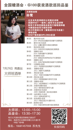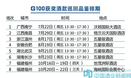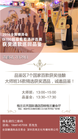 “G100超級葡萄酒評選賽獲獎酒款巡回品鑒”第二站將于7月29日在南昌舉辦,屆時G100專家評委孫鶯將擔任南昌站大師班帶領品鑒老師,來自7個國家的16款G100精選獲獎酒品和百款獲獎佳釀分別在大師班和自由品鑒區(qū)展出。