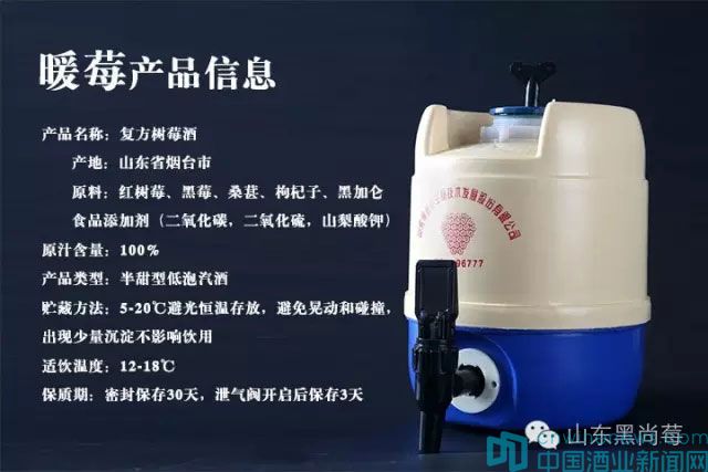 暖莓歷經(jīng)45天低溫冷浸漬發(fā)酵,富含紅樹莓、枸杞、黑莓、桑葚、黑加侖五種漿果,酒體呈美麗的寶石紅色,原汁發(fā)酵,高品質(zhì);暖莓酒精度8度,口感適中,男女皆宜。