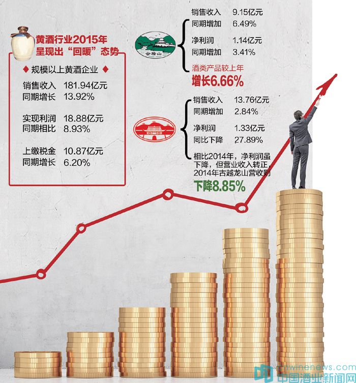 《華夏酒報》記者查詢中國酒業(yè)協(xié)會的報告也顯示,黃酒行業(yè)2015年呈現(xiàn)出“回暖”態(tài)勢,2015年規(guī)模以上黃酒企業(yè)累計完成銷售收入181.94億元,與上年同期相比增長13.92%;累計實現(xiàn)利潤總額18.88億元,與上年同期相比增長8.93%;上繳稅金10.87億元,比上年同期增長6.20%。