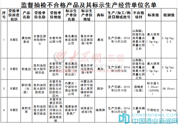 在東營(yíng)區(qū)源豐購(gòu)物中心抽檢的晨旭魷魚(yú)絲檢出山梨酸超標(biāo);