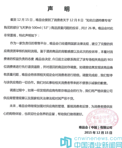 2015年12月上旬,有網友在論壇發帖爆料稱,唯品會在12月7日至12月11日推出的大型酒類促銷活動,其“知名白酒特惠專場”所售茅臺酒涉假。并從外包裝、重量、防偽碼等多方面論證了唯品會此次活動所售茅臺全部為假。對此,12月15日唯品會發布聲明稱,的確收到了26單投訴,將對購買產品的903名消費者先行退貨退款,并對退回商品封存調查,調查完成前,暫停與相關供應商的一切合作。