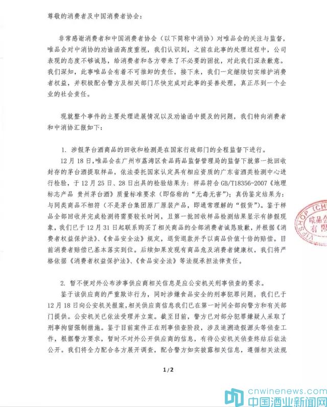 既然檢測結果顯示所售茅臺酒不是原裝產品,為什么不承認是假?聲稱產品無毒無害又說明什么?供應商到底是哪家為什么遲遲不公開?唯品會依然沒有回應。對此,1月5日,中國消費者協會發出了“中國消費者協會致唯品會(中國)有限公司的勸諭函”,全文如下:
