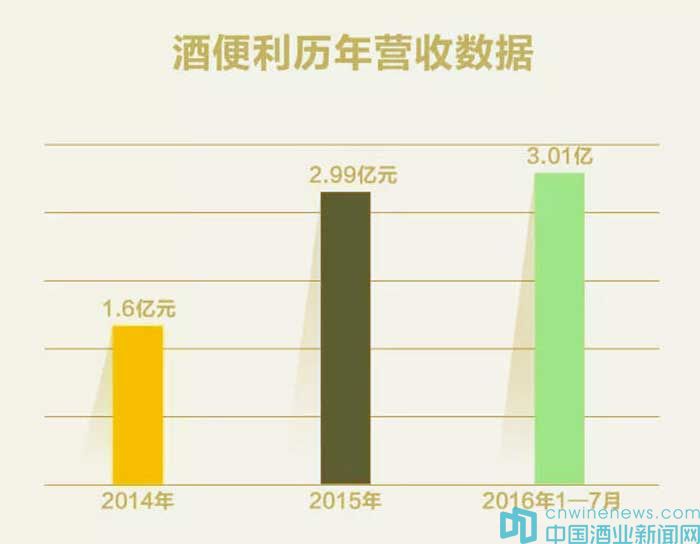 據酒便利向記者提供的數據,2016年1-7月,公司實現收入(含稅)達3.01億元,較2015年1-7月同比增長58.83%;這也意味著,截止7月底,酒便利的營收已經超過了2015年全年的2.99億營收。